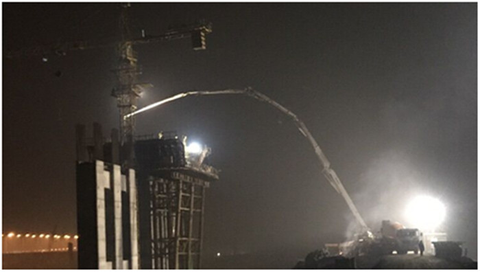當(dāng)晚23點47分,隨著高壓混凝土輸送泵最后一泵混凝土輸送至26米的高空,府河特大橋1#墩左幅1#塊懸澆箱梁完成。此工期節(jié)點的順利完成也標志著府河特大橋上部構(gòu)造施工取得了階段性勝利,為下一步懸臂掛籃施工的順利開展打下了堅實的基礎(chǔ)。